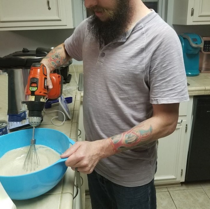 (8) A férjem sütés közben az elromlott botmixerünk helyett az akkus fúróját hívta segítségül.