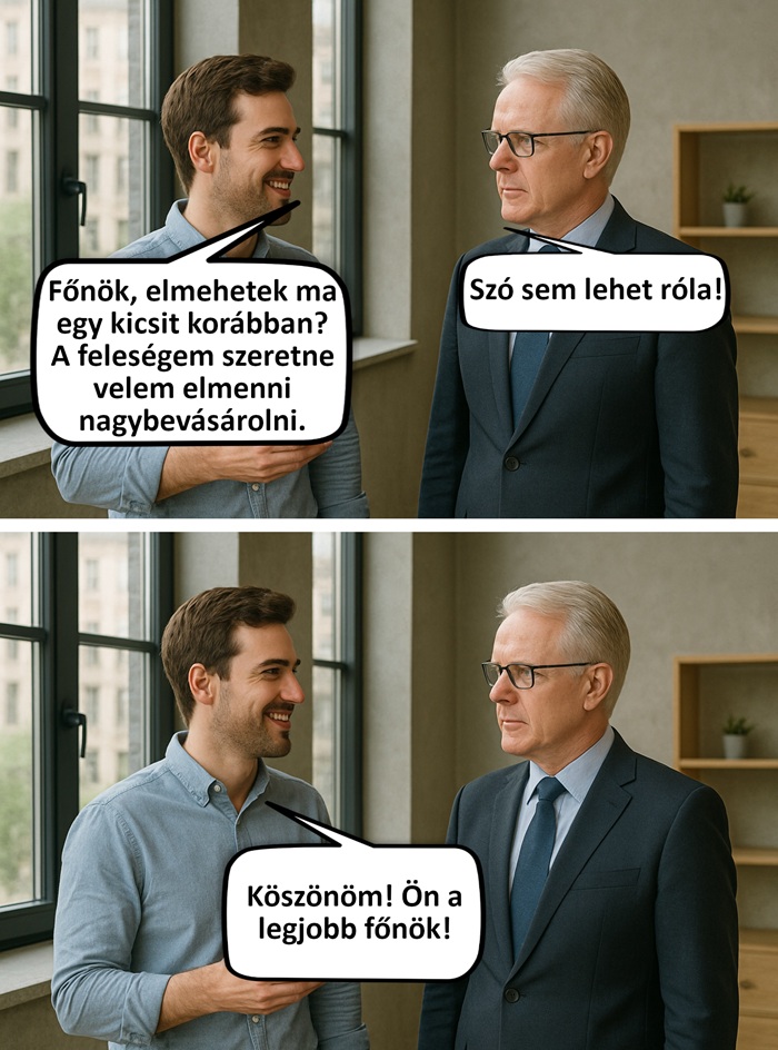 (1) A férj mindent megtett, hogy a főnök hamarabb elengedje a melóból, és elmehessen a feleségével vásárolni, de a főnök sajnos hajthatatlan volt.