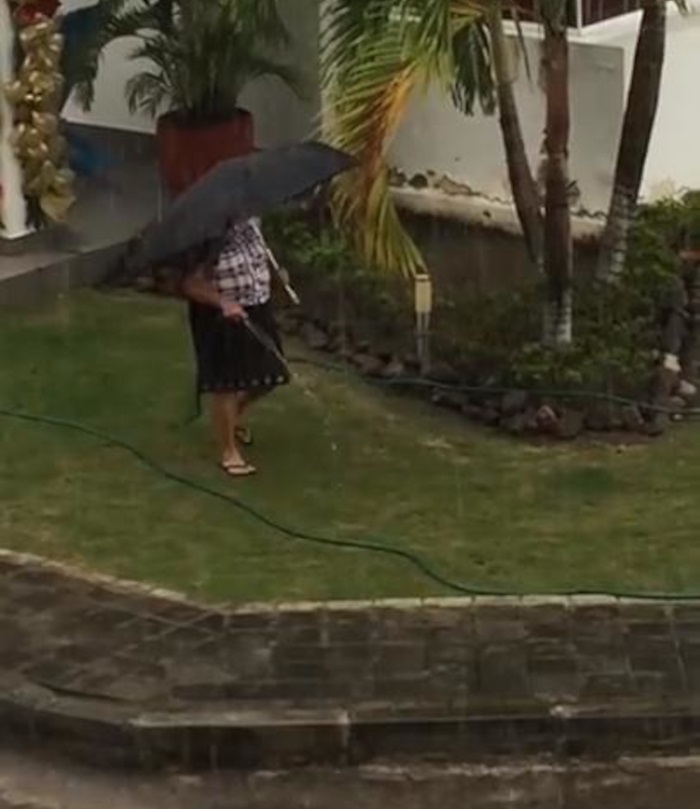 (4) Ez a nő elkezdte locsolni az udvarán a pázsitot, ám közben eleredt az eső. Ekkor beszaladt egy esernyőért és folytatta a locsolást, mintha mi sem lenne természetesebb.