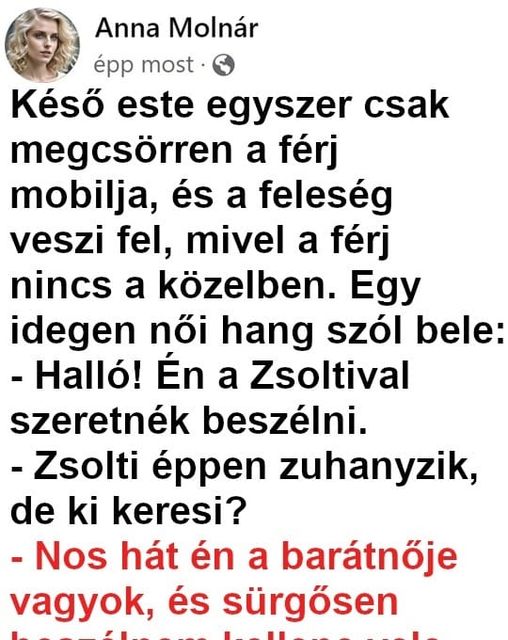 Én a Zsoltit keresem.– Éppen zuhanyzik, de ki keresi?– Hát én a barátnője vagyok, és sürgősen beszélnem kell vele.És azzal le is teszi.