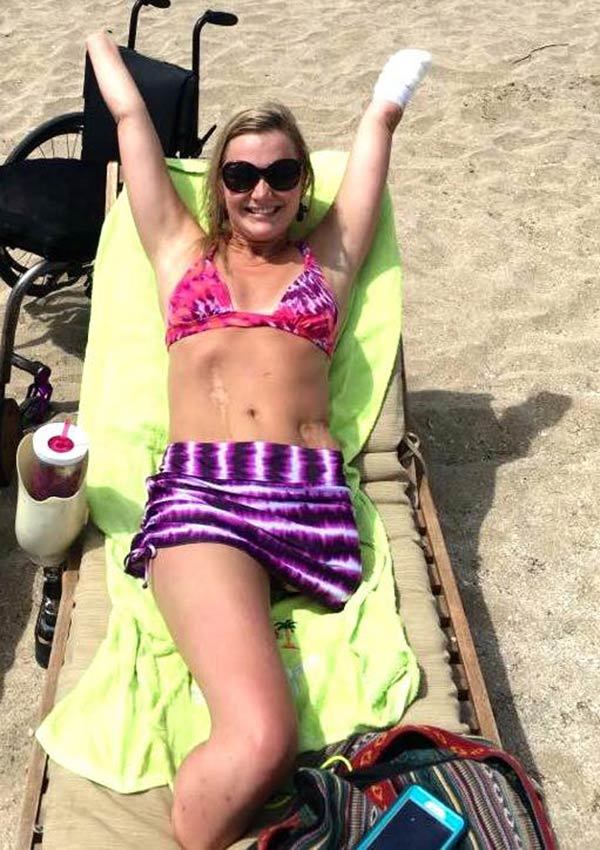 Aimee bikiniben a tengerparton büszkén mutatja meg a testét úgy, ahogy van – hegekkel és amputált végtagokkal.