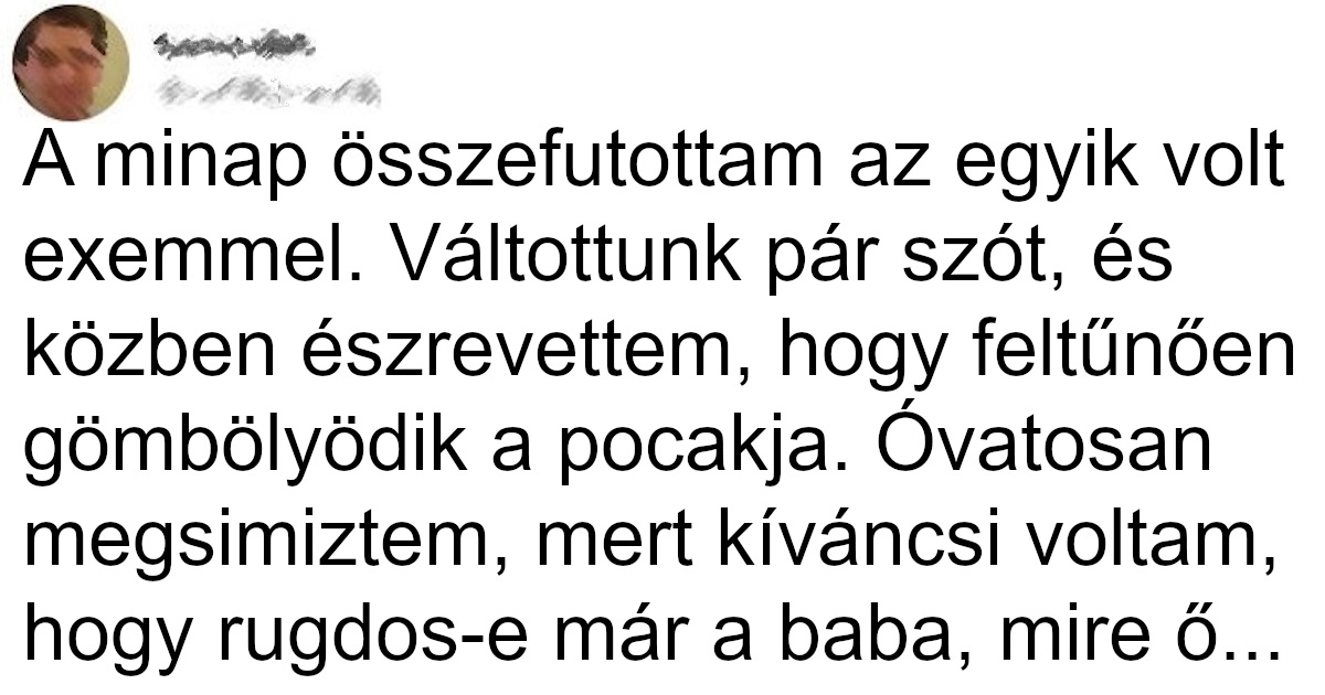 10. A minap összefutottam az egyik volt exemmel. Váltottunk pár szót, és közben észrevettem, hogy feltűnően gömbölyödik a pocakja. Óvatosan megsimiztem, mert kíváncsi voltam, hogy rugdos-e már a baba, mire ő nagyon furán nézett rám, és megkérdezte, hogy mégis mit művelek?!