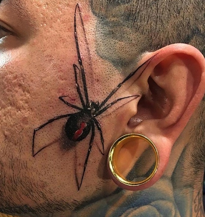 2. Ebben az esetben nem a kivitelezéssel van a probléma. Sőt, talán túl élethűre is sikerült. A kérdés csak az, hogy mégis mi visz rá valakit, hogy egy Fekete özvegy pókot tetováltasson az arcára? Na meg az, hogy milyen esélyekkel indul így az úriember, amikor egy állásra pályázik?